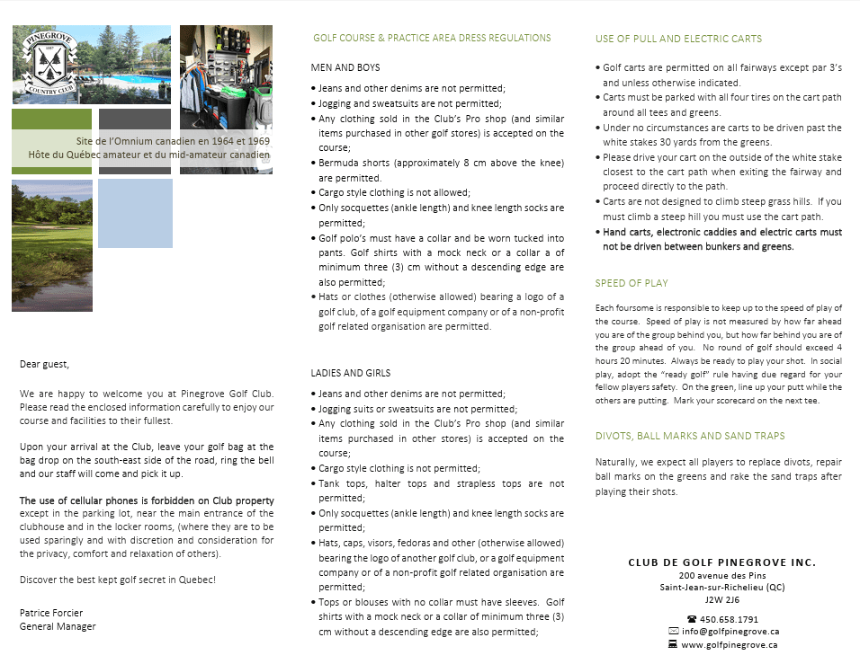 Each foursome must maintain the pace of play on the course. Speed is not determined by the distance ahead of the rear quartet, but rather by the distance behind the one in front. A golf match must not exceed 4 hours and 20 minutes. You must meet your tee time at each of the clocks along the course. Always be ready to play your shot. Adopt the “hit when ready” rule while keeping in mind the safety of your fellow players. Once on the green, line up your putt while the others play. Mark your scorecard at the next tee.